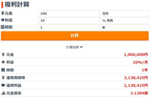 100万円の元手で、実績よりも下回る『月利10%』で計算すると、1年後には、『3.1384倍』の『313万8,425円』になります。